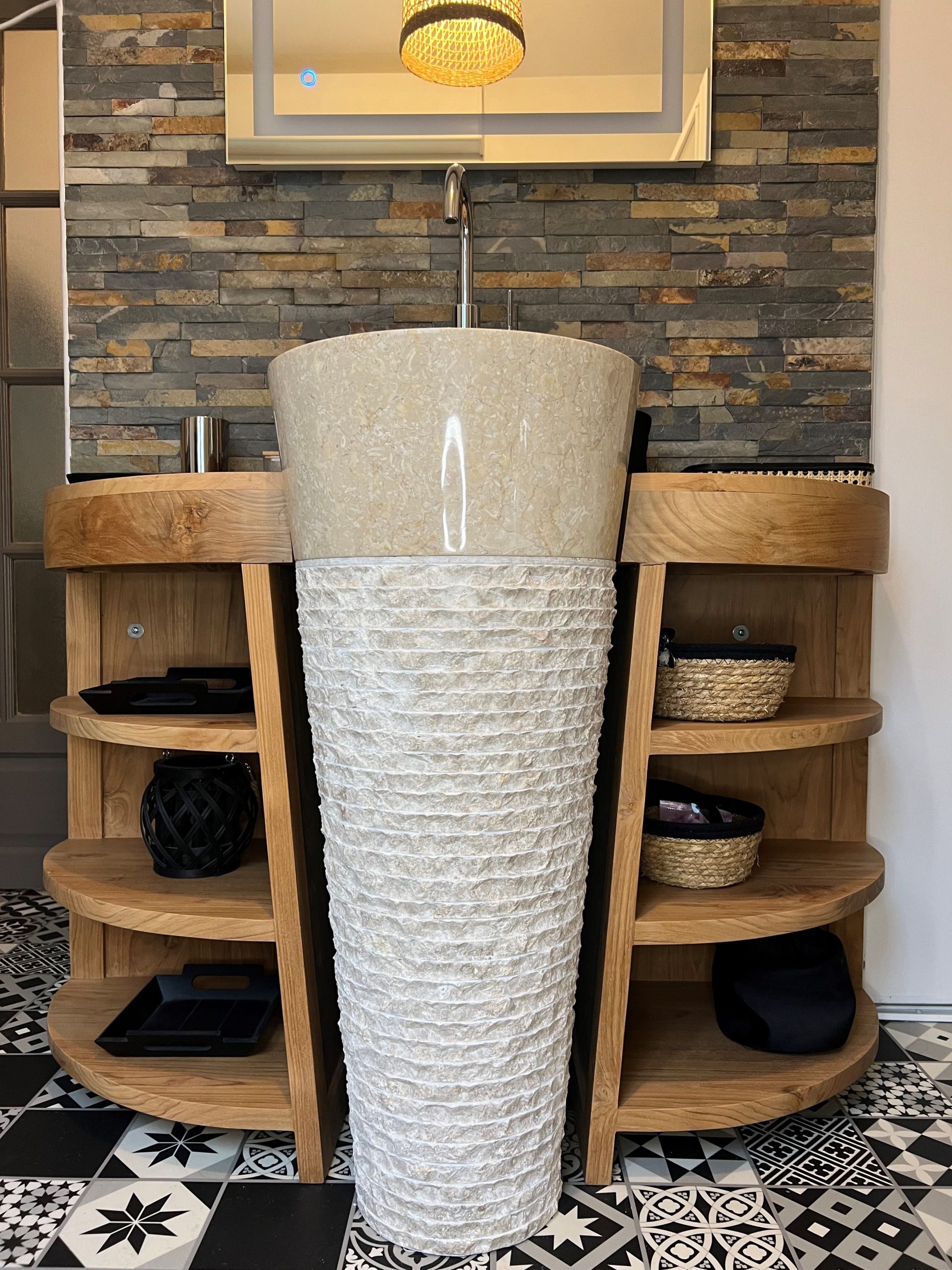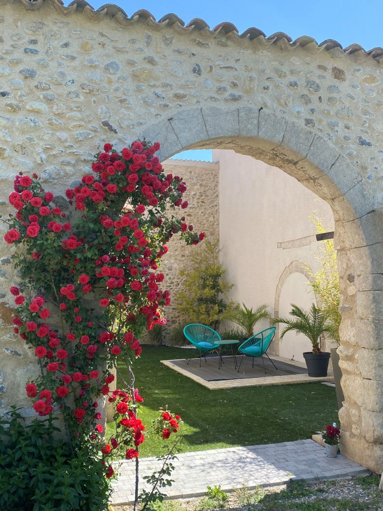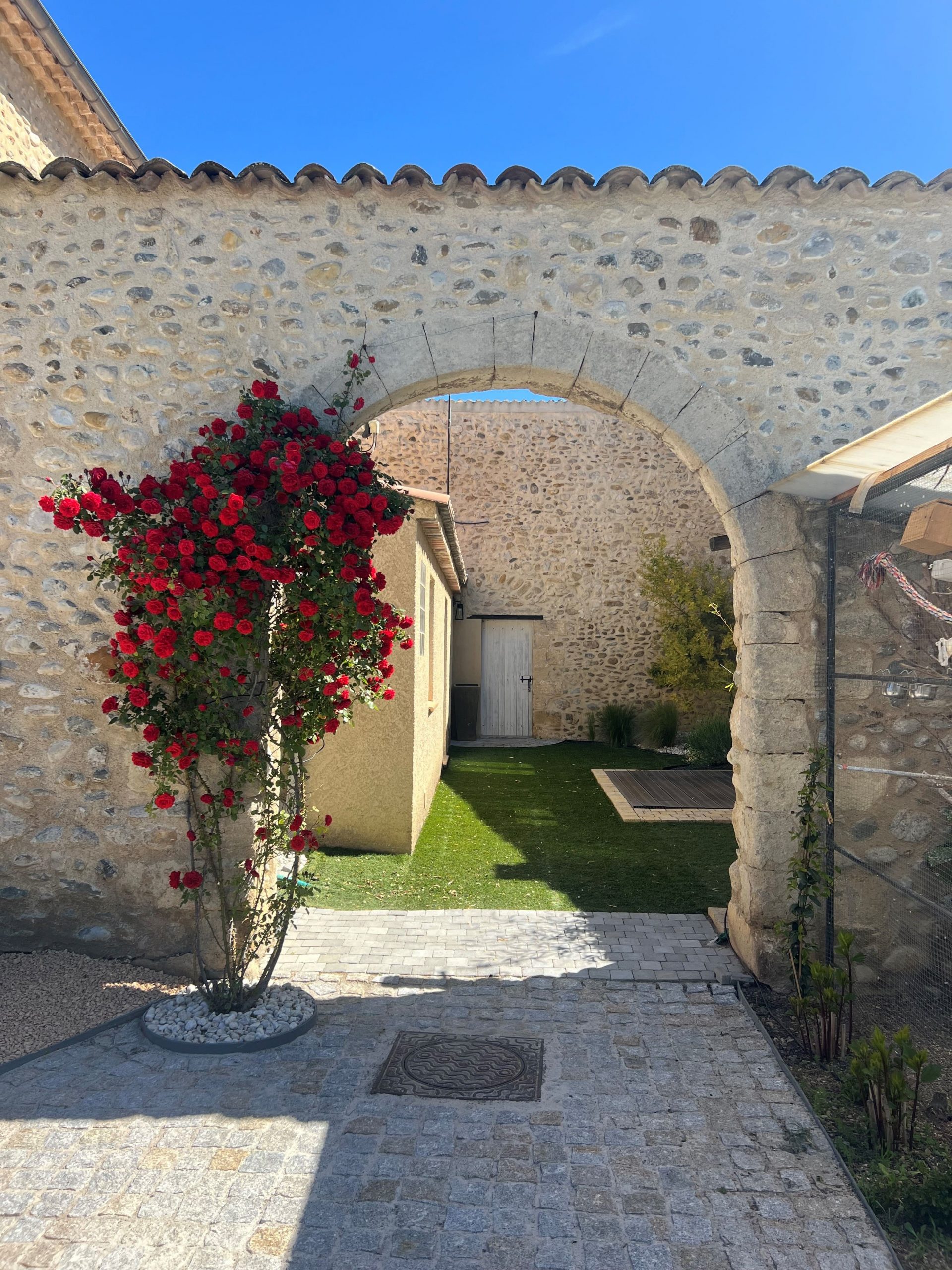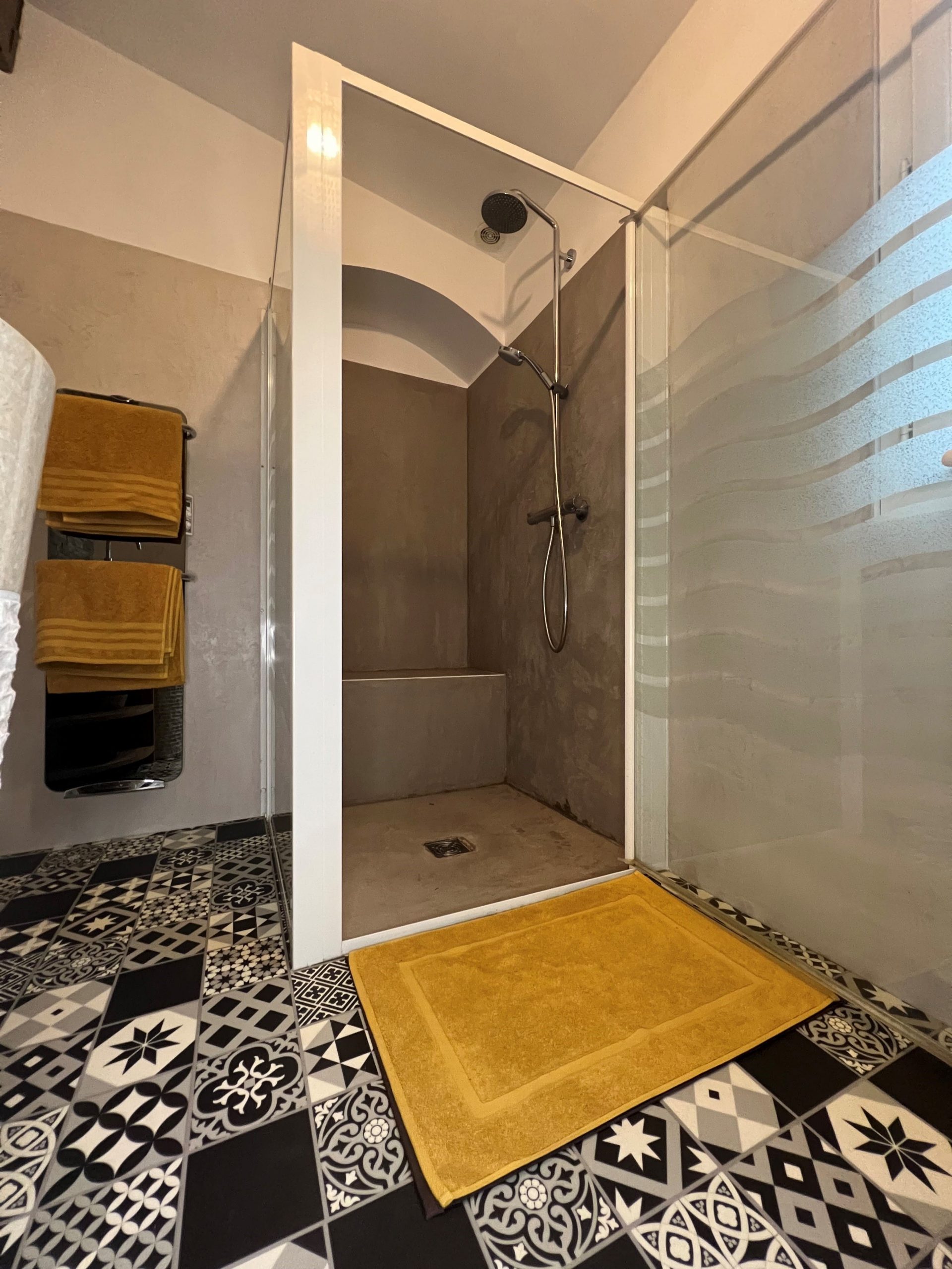 En rez-de-chaussée, la chambre Durance offre un espace plus indépendant, pensé pour celles et ceux qui recherchent calme et intimité. Son accès est dévoilé par une arche en pierre de Durance, qui mène sur une cour privative d’environ 80 m².