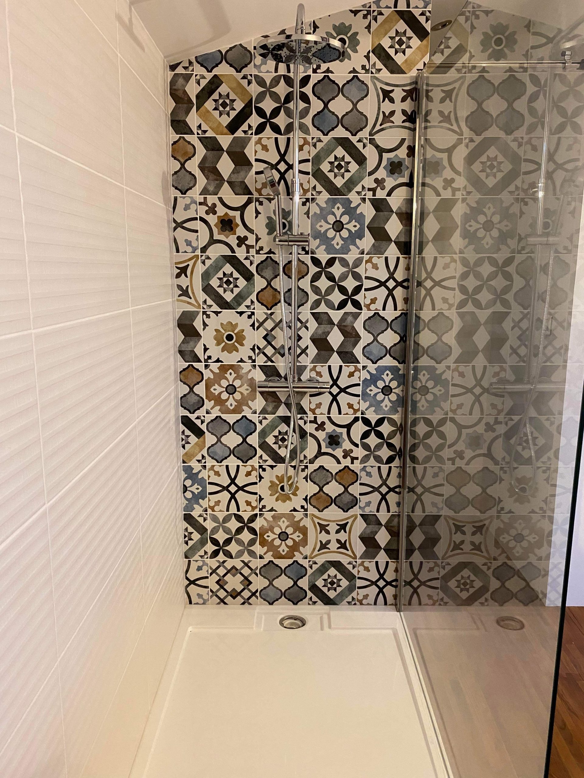 Dès l’entrée, le regard est attiré par la grande tête de lit en bois, entièrement réalisée par nos soins. Plus qu’un élément décoratif, elle structure la chambre et crée une séparation élégante entre l’espace nuit et l’espace salle de bain, offrant à la fois intimité et fluidité.