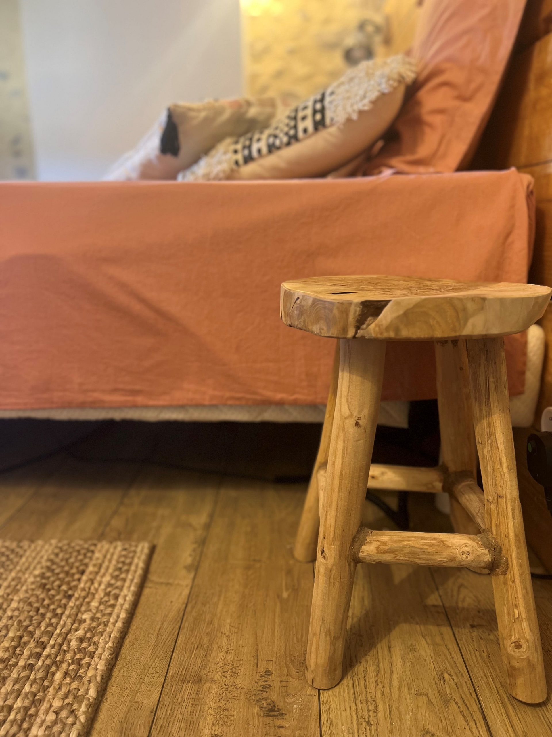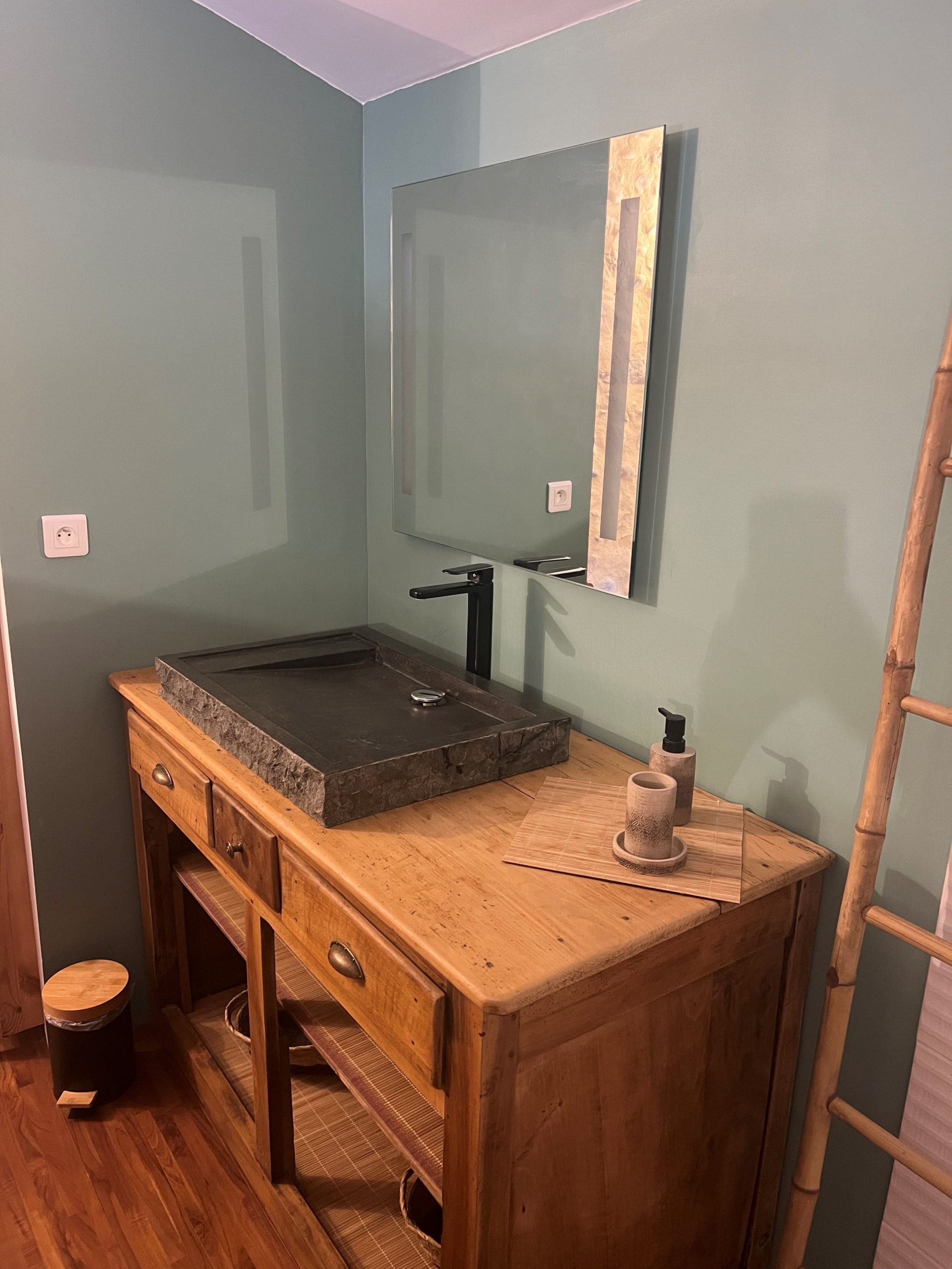 Chaque détail a été pensé avec soin : meubles chinés et restaurés, bois massif remis en valeur, pièces anciennes détournées de leur usage d’origine. Le meuble de salle de bain, autrefois commode, dialogue avec une vasque en pierre, tandis qu’un ancien élément d’armoire transformé en meuble TV trouve une seconde vie.