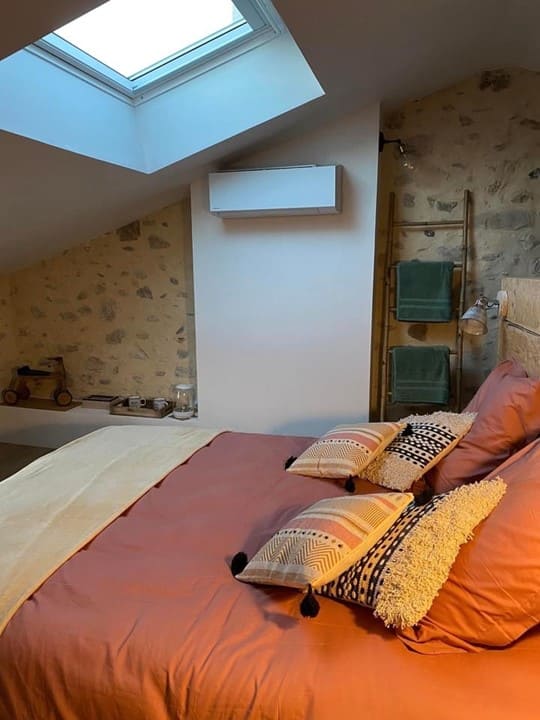Elle offre de beaux volumes, une vue dégagée sur les terres agricoles environnantes et tout le confort nécessaire : lit électrique 160×200, douche à l’italienne intégrée, WC séparés et climatisation.